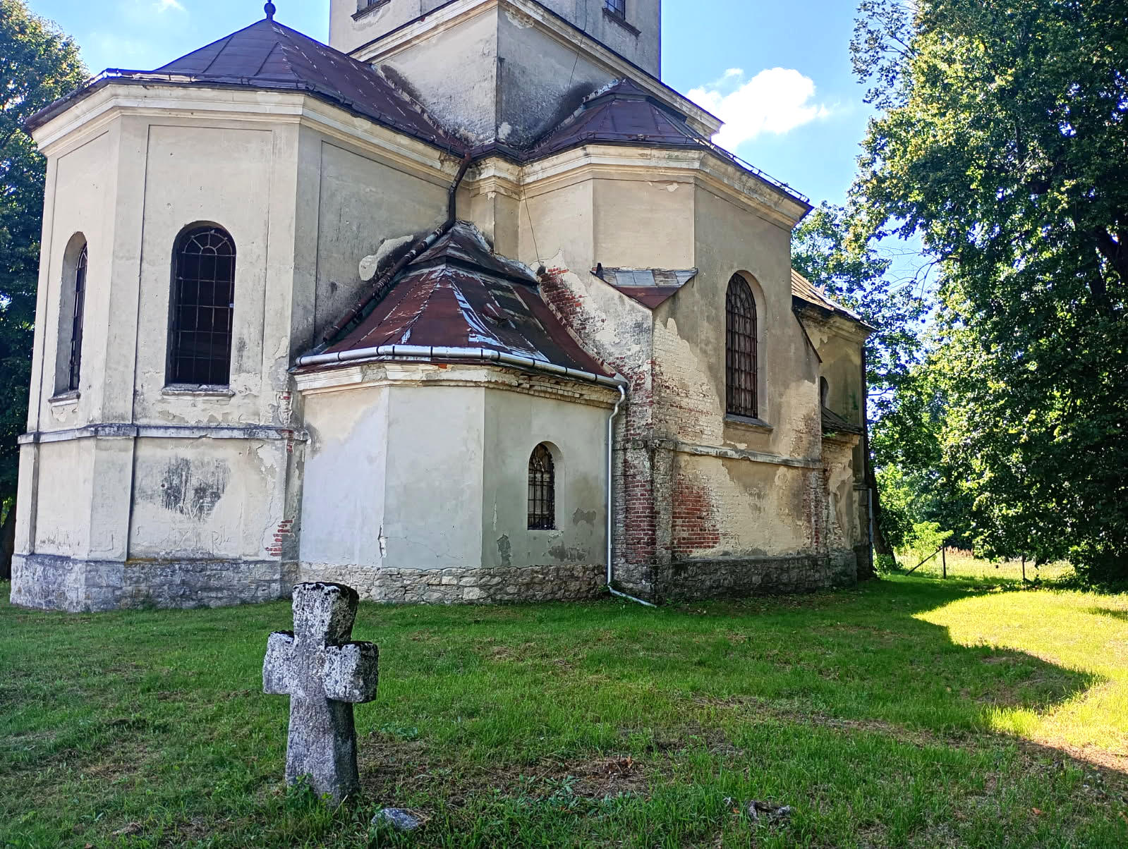 Dotykam nagrzanego kamienia i pod palcami czuję jego kruchość. Mikroskopijne ziarenka piasku, osypują się i wpadają do gęstej roślinności, jak do wielkiej studni bez dna. Wiedziona ciekawością chciałam zajrzeć jeszcze do zakamarków, ale moja ciekawość przegrała z gęstymi krzewami, które stały na straży chroniąc to, co jeszcze pozostało. Ostrożnie wycofałam się, aby nie skaleczyć ciała ostrymi cierniami krzewów tarniny i udałam się na przycerkiewny cmentarza, na którym prawdopodobnie znajdują się krzyże z XVII wieku, a także późniejsze z lat 80 – tych XIX w. Patrzę jak wyłaniają się z ziemi i poddają naturze, chyląc coraz bardziej w kierunku podłoża.